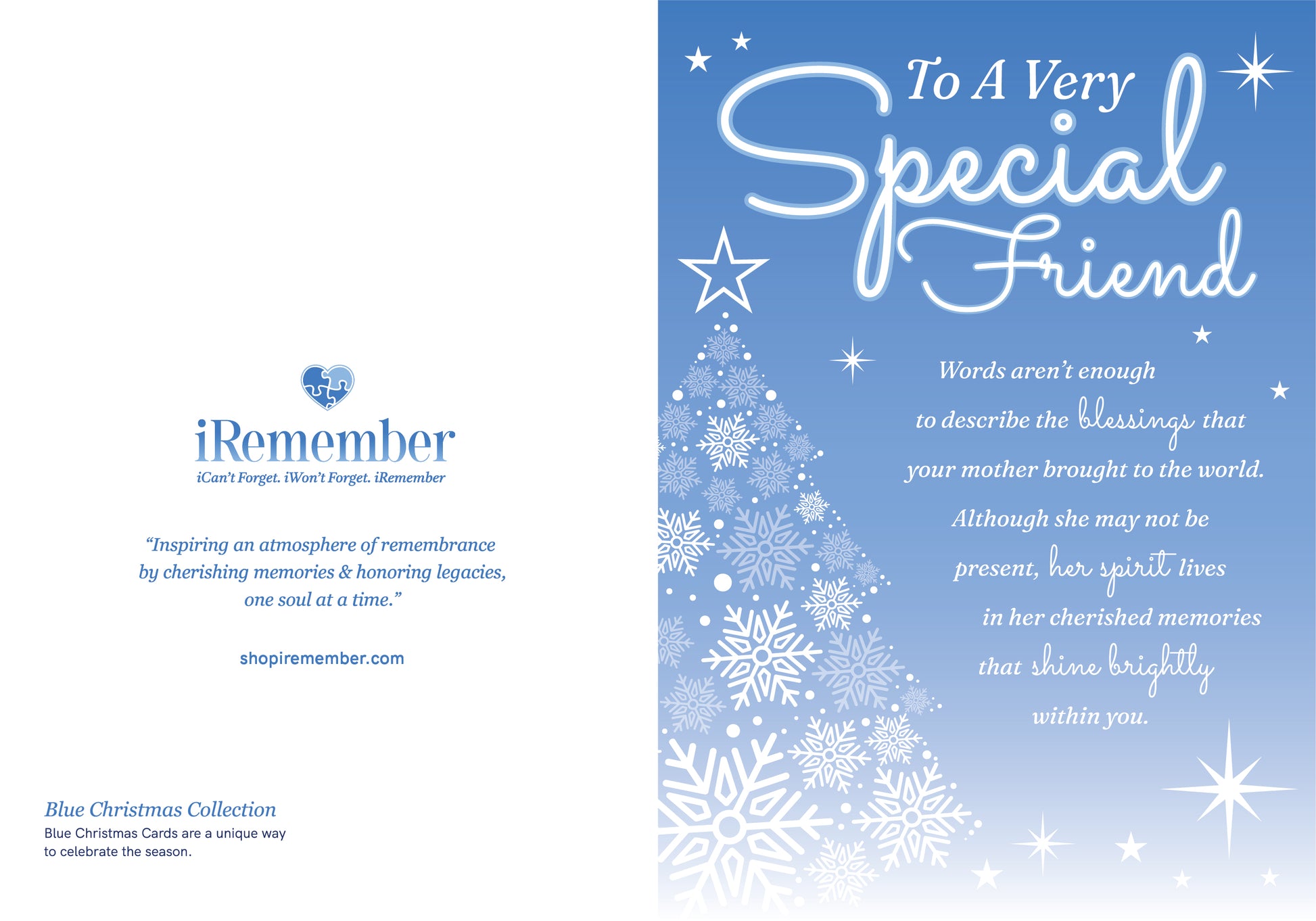 Blue Christmas Cards are a unique way to celebrate the season. This greeting card from our collection is perfect if you are looking for a Christmas card to give to a friend that shows deep appreciation while also acknowledging how he or she feels about celebrating Christmas with the loss of a mother. It comes in size 5 x 7(closed) with a beautiful letter to a very special friend.